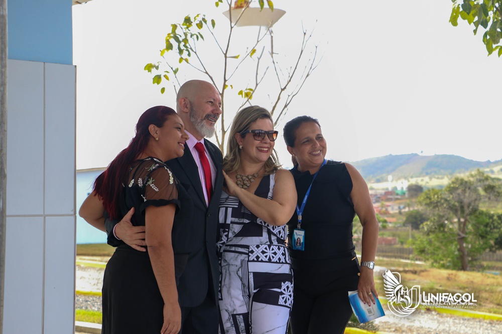 O reitor da UNIFACOL, Túlio Duarte, a coordenadora do curso de Direito, Maria Paula Latache, o coordenador do Núcleo de Práticas Jurídicas, Felipe Moura, a assistente social, Ângela Fernanda, e os juízes Hugo Vinicius Castro Jiménez e Anna Paula Coutinho acompanharam a cerimônia.